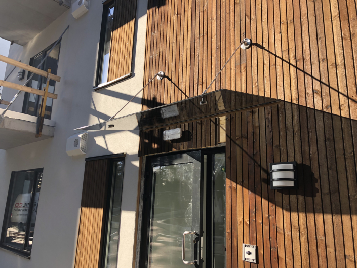 Baldakinen / Entrétaket er laget av rustfritt stål og 17,52 mm herdert laminert glass som får hverken riper eller taper farge. Velg mellom 3 forskjellige glassfarger; Klart, sotet eller frostet.